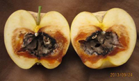 只危害果實(shí)。分為霉心型和心腐型。初期心室組織變褐壞死,后向外擴(kuò)展,果肉變褐色或者深褐色,味苦,可從果柄洼出爛透。心室內(nèi)充滿白色、黑褐色、青綠色或者粉紅色霉層,以粉紅色霉層最常見(jiàn)。幼果發(fā)病,內(nèi)外常包敷紅粉。北斗、元帥系品種的病果易脫落,青香蕉的病幼果多在樹(shù)上變黃,國(guó)光則干縮成黑色小僵果,掛在樹(shù)上經(jīng)冬不落。