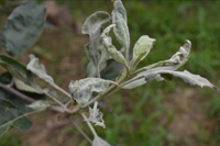 主要為害嫩枝、葉片、新梢,也為害花及幼果。病部滿布白粉是此病的主要特征。幼苗被害,葉片及嫩莖上產(chǎn)生灰白色斑塊,發(fā)病嚴(yán)重時(shí)葉片萎縮、卷曲、變褐、枯死,后期病部長(zhǎng)出密集的小黑點(diǎn)。大樹(shù)被害,芽干癟尖瘦,春季發(fā)芽晚,節(jié)間短,病葉狹長(zhǎng),質(zhì)硬而脆,葉緣上卷,直立不伸展,新梢滿覆白粉。生長(zhǎng)期健葉被害則凹凸不平,葉綠素濃淡不勻,病葉皺縮扭曲,甚至枯死。