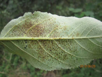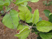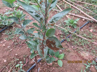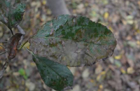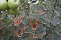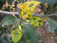 不同蘋果品種的感病性有明顯差異。高溫多雨,當(dāng)氣溫在10-20℃,光照較強(qiáng),癥狀較重。樹(shù)勢(shì)衰弱時(shí),癥狀較重,幼樹(shù)比成株易發(fā)病。土壤干旱,水肥不足時(shí)發(fā)病重。