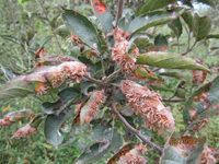 主要為害葉片,也能為害嫩枝、幼果和果柄 。葉片初患病正面出現(xiàn)油亮的橘紅色小斑點(diǎn),逐漸擴(kuò)大,形成圓形橙黃色的病斑,邊緣紅色。發(fā)病嚴(yán)重時(shí),一張葉片出現(xiàn)幾十個(gè)病斑。發(fā)病1~2周后,病斑表面密生鮮黃色細(xì)小點(diǎn)粒,初為桔黃色,后變?yōu)楹谏2“弑趁媛∑穑瑓采鷾\黃色毛狀物。果實(shí)受害,初生黃色小點(diǎn),后變褐色,病斑四周有與葉背相同的毛狀物。
