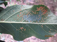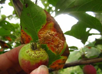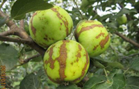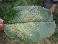 病菌在檜柏上為害小枝,即以茵絲體在菌癭中越冬。第二年春天形成褐色的冬孢子角。冬孢子柄被有膠質(zhì),遇降雨或空氣極潮濕的胺化膨大,冬孢子萌發(fā)產(chǎn)生大量擔(dān)孢子,隨風(fēng)傳播到蘋果樹(shù)上。銹菌侵染蘋果樹(shù)葉片、葉柄、果實(shí)及當(dāng)年新梢等,發(fā)病期持續(xù)一個(gè)月。
