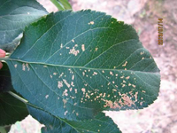 蘋果綿蚜一年發(fā)生8—9代,主要以一齡和少數(shù)二齡若蟲在樹(shù)體上群聚越冬。越冬的部位大多在中、下部的主枝和大枝上。在枝干上有愈傷組織、剪鋸口、皮隙縫等處或在根瘤上群集。越冬的成活率隨越冬群體的大小而不同,群體越大,成活率越高。來(lái)年春季,在4月初開(kāi)始為害。5月上、中旬為田間蔓延階段,6月—7月中旬是該蟲大量繁殖,蔓延、擴(kuò)散的重要時(shí)期,往往綿狀物累累全樹(shù),造成嚴(yán)重為害。因此5月份蟲群尚未擴(kuò)散是防治的關(guān)鍵時(shí)期。7月下旬—8月中旬蟲口數(shù)量迅速下降,其原因是高溫和寄生蜂的原故。