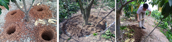 為了促進芒果根系正常生長和再生,在不同時期應對果園做深耕和翻土處理。冬季(或采果修剪后)應結合深翻改土,沿樹冠垂直線下挖(60cm深、30cm寬)環(huán)溝、對溝或圓形溝,切斷土壤下層的粗根,經曬五、六天,然后施采果肥,用表土和植物殘體加以回填。結合清園,進行中耕翻土(20cm深),以切斷表土的吸收根,減弱地下部分對地上部分水分和養(yǎng)分輸送,有利地上部分營養(yǎng)物質積累,促進花芽分化。