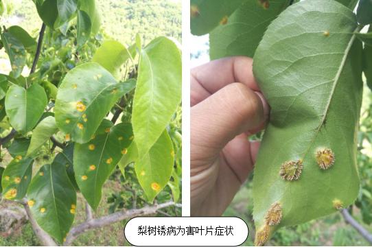 在病斑出現橘黃色黏液時噴施梨膠銹菌重寄生菌等,可以寄生消解梨銹病的病菌,從而逐年減輕銹病的危害。