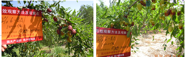 2014年6月,山西臨猗縣廟上鄉城東村劉魁,在冬棗謝花后噴施國光植生源1000倍+國光優豐1500倍,連續使用2次,間隔7天噴一次,用藥20天后,使用保果膨果套餐冬棗,保果效果好,棗果膨大明顯;未使用保果套餐冬棗,保果效果差,棗果膨大不明顯。