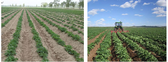 馬鈴薯培土可使植株埋入土下的節數增多,增加匍匐莖的數量,形成更多和更大的塊莖,防止干旱裂畦,塊莖見光導致薯皮發青。在苗期當株高10~15厘米左右時,結合中耕除草進行第一次適當培土,做到鋤通壟背、靠緊壟眼,除盡雜草,不傷根苗;在苗高25厘米左右時進行第二次中耕培土,培土5~7厘米;在開花前進行第三次中耕鋤草,高培土,以利于結薯。