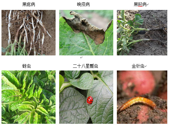 以預防為主,及時防治病蟲害。苗期——開花期的主要病害有黑痣病、早疫病、晚疫病、黑脛病、環腐病等。黑痣病近兩年在馬鈴薯上發生比較多,特別是在苗期地溫較低、濕度大的情況下易發生,嚴重影響馬鈴薯幼苗的生長。對于黑痣病可以在苗期(苗高10-20cm)使用30%噁霉靈水劑(如國光重茬寶)進行噴灌或滴灌,能有效控制黑痣病的發生。另外,如果連續一周以上的陰雨天氣,就容易發生晚疫病,對晚疫病要以預防為主,在出苗率達95%后用代森錳鋅、甲霜靈錳鋅進行預防,發病初期開始噴灑甲霜靈、霜脲氰、三乙膦酸鋁等藥劑隔7~10天1次,連續防治2~3次,也可以使用國光三治(50%錳鋅·氟嗎啉)80-107g/畝噴霧進行防治。對于早疫病可以使用百菌清、代森錳鋅等藥劑進行預防,在發病初期可以使用甲霜靈錳鋅、霜脲錳鋅、苯醚甲環唑等藥劑進行防治。對于黑脛病、環腐病等細菌性病害可以使用農用鏈霉素、銅制劑等藥劑進行預防,若發現病株及時清除。此期馬鈴薯的主要害蟲有蚜蟲、28星瓢蟲、薊馬、跳甲、金針蟲、蠐螬、小地老虎。對于蚜蟲、薊馬可以使用吡蟲啉、啶蟲瞇等藥劑進行防治,對于瓢蟲、跳甲、地下害蟲等可以使用氯氰菊酯加上甲維鹽防治。