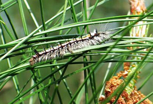 松毛蟲繁殖力強,產卵量大,卵多成塊或成串產在未曾受害的幼樹針葉上。1-2齡幼蟲有群集和受驚吐絲下垂的習性;3齡后受驚擾有彈跳現象;幼蟲一般喜食老葉。成蟲有趨光性,以20時活動最盛。