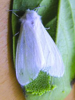 成蟲 白色中型蛾子,體長13—15mm。復(fù)眼黑褐色,口器短而纖細(xì);胸部背面密布白色,多數(shù)個體腹部白色,無斑點,少數(shù)個體腹部黃色,上有黑點。雄成蟲觸角黑色,櫛齒狀;翅展23-34mm,前翅散生黑褐色小斑點。雌成蟲觸角褐色,鋸齒狀;翅展33—44mm,前翅純白色,后翅通常為純白色。